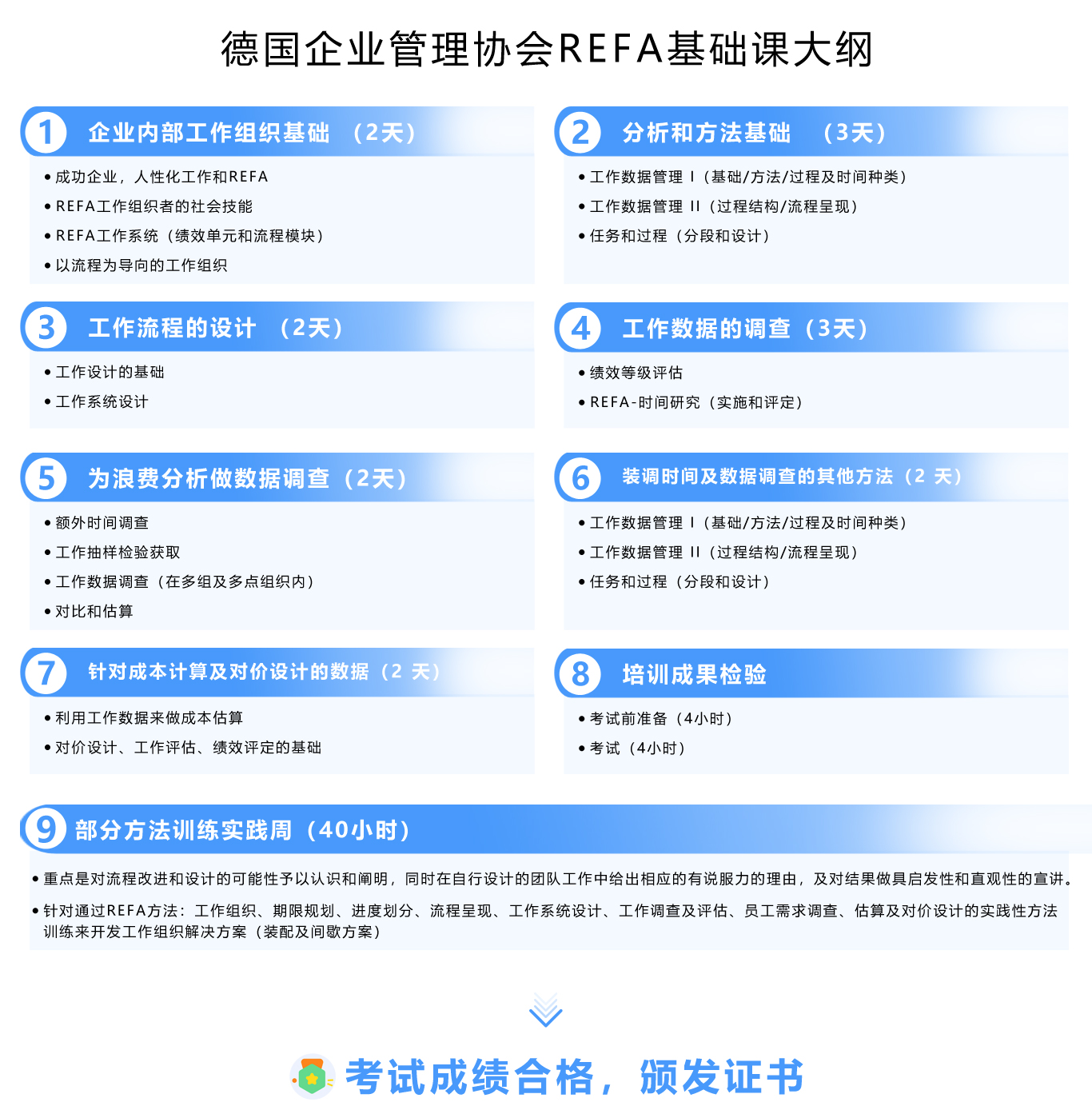 REFA – 德国企业管理协会于1924 年9 月成立,是当今世界上历史最悠久、规模最大的劳动研究和企业管理组织。REFA 的目标是结合企业生产能力和员工需求为企业定制盈利的解决方案。对高效工作流程的开发是REFA 的第一次重要创新成果。